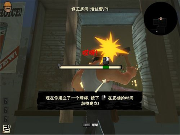 一開始操縱杰克大叔,要迅速找到鑰匙之后去樓上開門找到麥克,搜索物品找到電視天線,下樓把天線裝到電視機(jī)上,喪尸們喜歡看電視,這一關(guān)可以得到新的窗口修補(bǔ)技術(shù),三個(gè)人物都可以使用