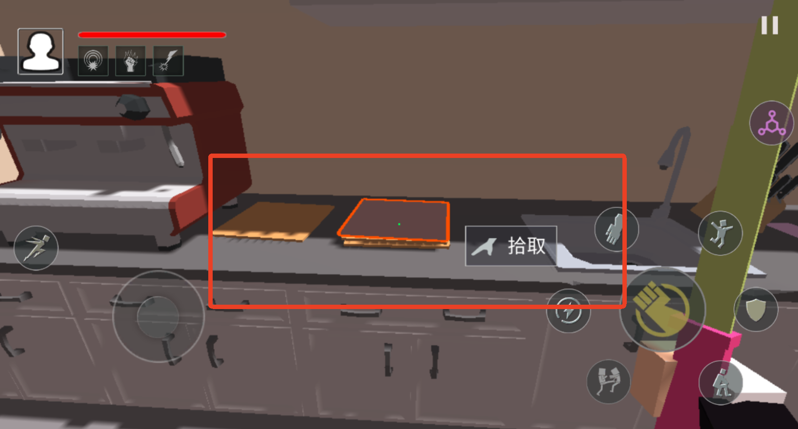 3、往前走,靠經這個桌子時就會出現可以拾取的選項,對應的物品就會有紅色的描邊。這把刀還是非常耐用的,推薦!