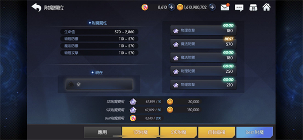 附魔:可以為裝備進(jìn)行附魔,左邊為可以洗的屬性,右邊則是洗出來(lái)的屬性,輸出洗對(duì)應(yīng)的攻擊,暴擊率和冷卻,技能增傷等,輔助盾洗生命防御以及減傷冷卻等,前期沒(méi)必要一定追求best,只要great就可以用,可以保存一下,洗到更好的再替換,材料主要來(lái)源于次元獸與遠(yuǎn)征;