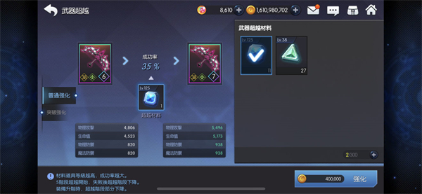 超越:目前超越只有武器開放,能提升大量的屬性,裝備等級(jí)越高提升也就越大,1-4只會(huì)失敗不會(huì)掉級(jí),5-9失敗會(huì)掉級(jí),6-7有保底超越,8-9只能通過(guò)最高級(jí)石頭才能100%成功(掉率十分感人),超越時(shí)會(huì)顯示概率,前期隨便拍賣買點(diǎn)低級(jí)石頭升個(gè)4就行,后期在考慮更高等級(jí),因?yàn)樯?jí)裝備會(huì)掉級(jí),建議升到最高后在進(jìn)行超越,材料來(lái)源于愛拉西瑞斯之錘,需要高練度才能通關(guān)。