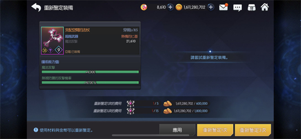 重新鑒定:可以重新鑒定裝備詞條,主要是第一詞條,選擇全部鑒定,輸出攻擊,輔助盾生命防御,第二詞條在洗好第一詞條后再洗,輸出為無(wú)視防御傷害,對(duì)boss傷害,暴擊傷害,暴擊率,pvp傷害,其中無(wú)視防御只有武器有,對(duì)boss傷害和pvp只有副武器有,可以看別人的裝備洗,材料主要通過(guò)Raid和次元裂隙獲取;
