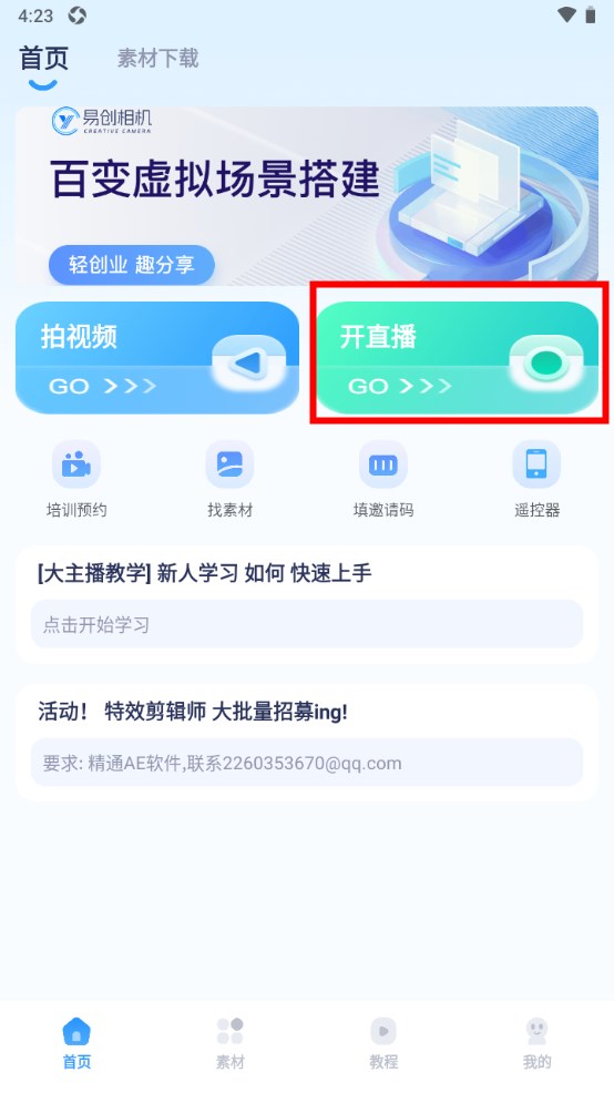 打開(kāi)易創(chuàng)相機(jī)APP:在易創(chuàng)相機(jī)APP中選擇“直播”選項(xiàng)。